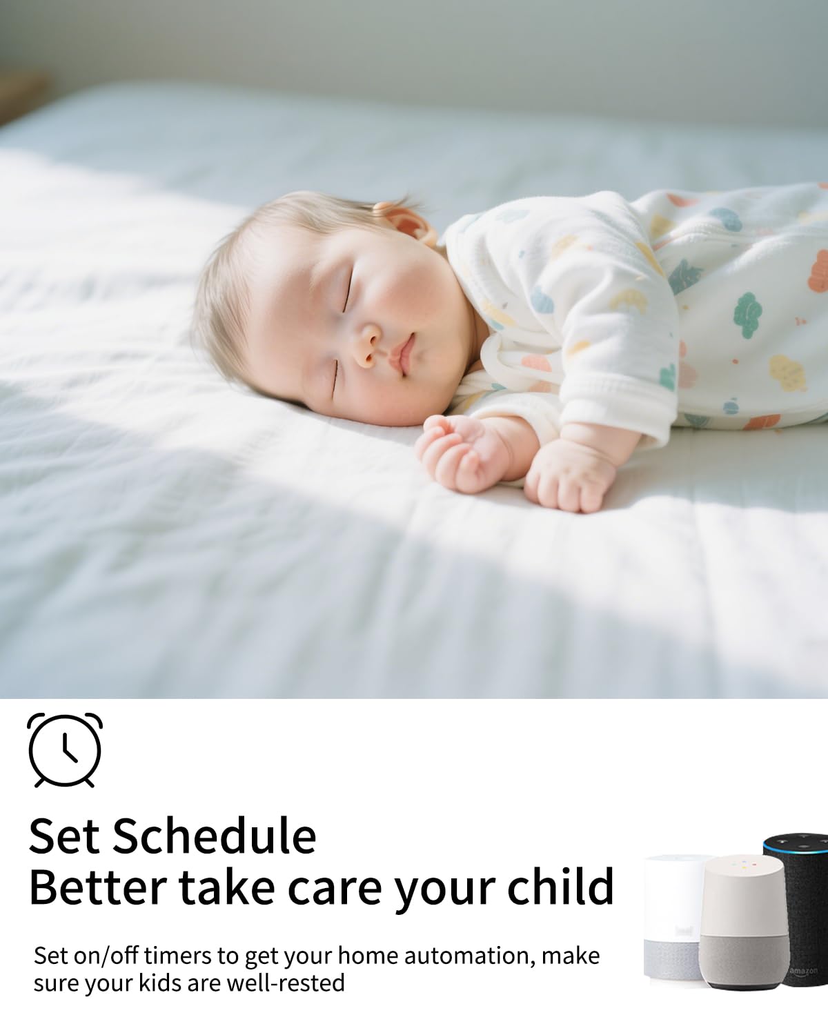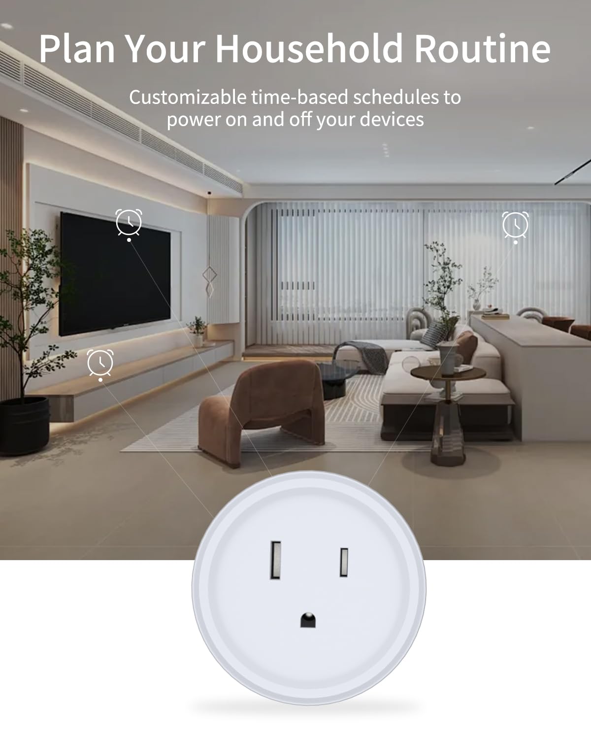 You can easily set timers, countdowns, cycles, or random schedules. For example, schedule the coffee maker to turn on automatically at 8 a.m. and the lights to turn off at 10 p.m.