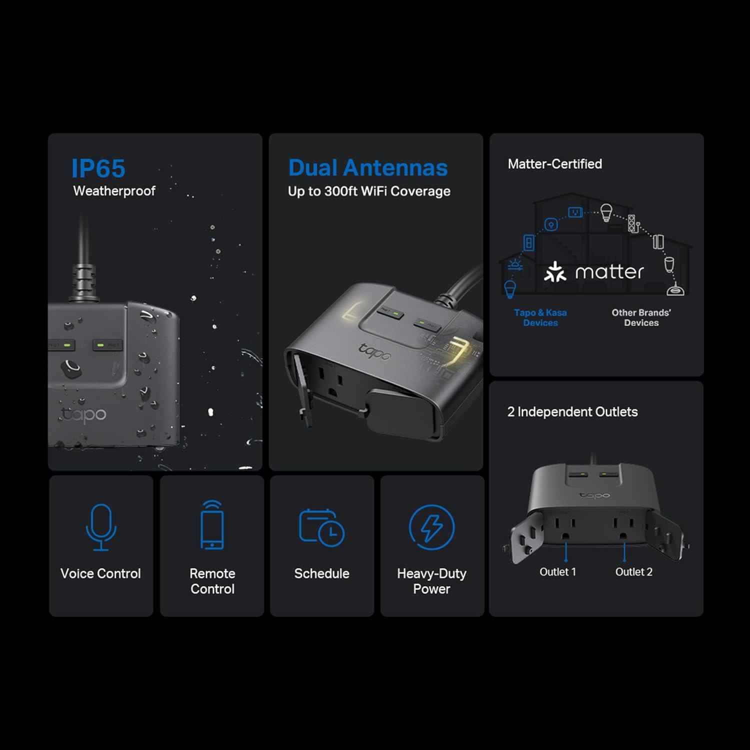 TP-Link Tapo Matter Outdoor Smart Plug, 2 Individual outlets, IP65 Weather Resistance, Works with Apple Home, Alexa, Google Home, Long Wi-Fi Range, 2.4G Wi-Fi Only, ETL Certified(Tapo P400M)