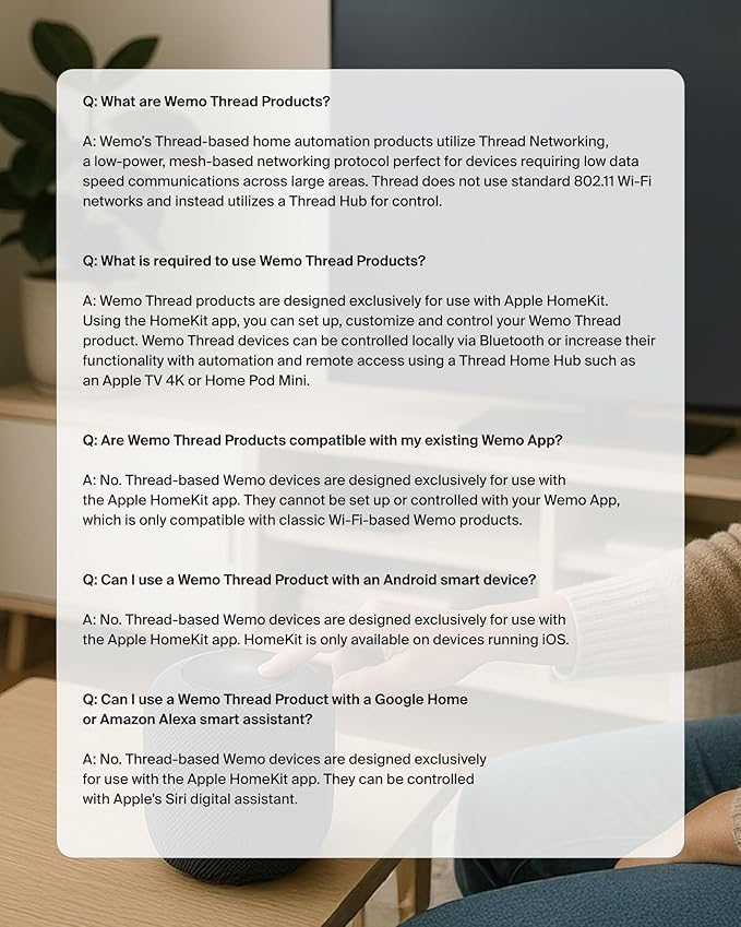 - CONTROL YOUR DEVICES FROM ANYWHERE: With the Wemo Smart Plug with Thread you can control your devices from anywhere using Apple HomeKit, the Apple Home App on iPhone & iPad, or by using Siri.